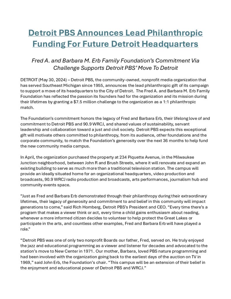 Detroit PBS, the community-owned, nonprofit media organization that has served Southeast Michigan since 1955, announces the lead philanthropic gift of its campaign to support a move of its headquarters to the City of Detroit.The Fred A. and Barbara M. Erb Family Foundation has reflected the passion its founders had for the organization and its mission during their lifetimes by granting a $7.5 million challenge to the organization as a 1:1 philanthropic match.