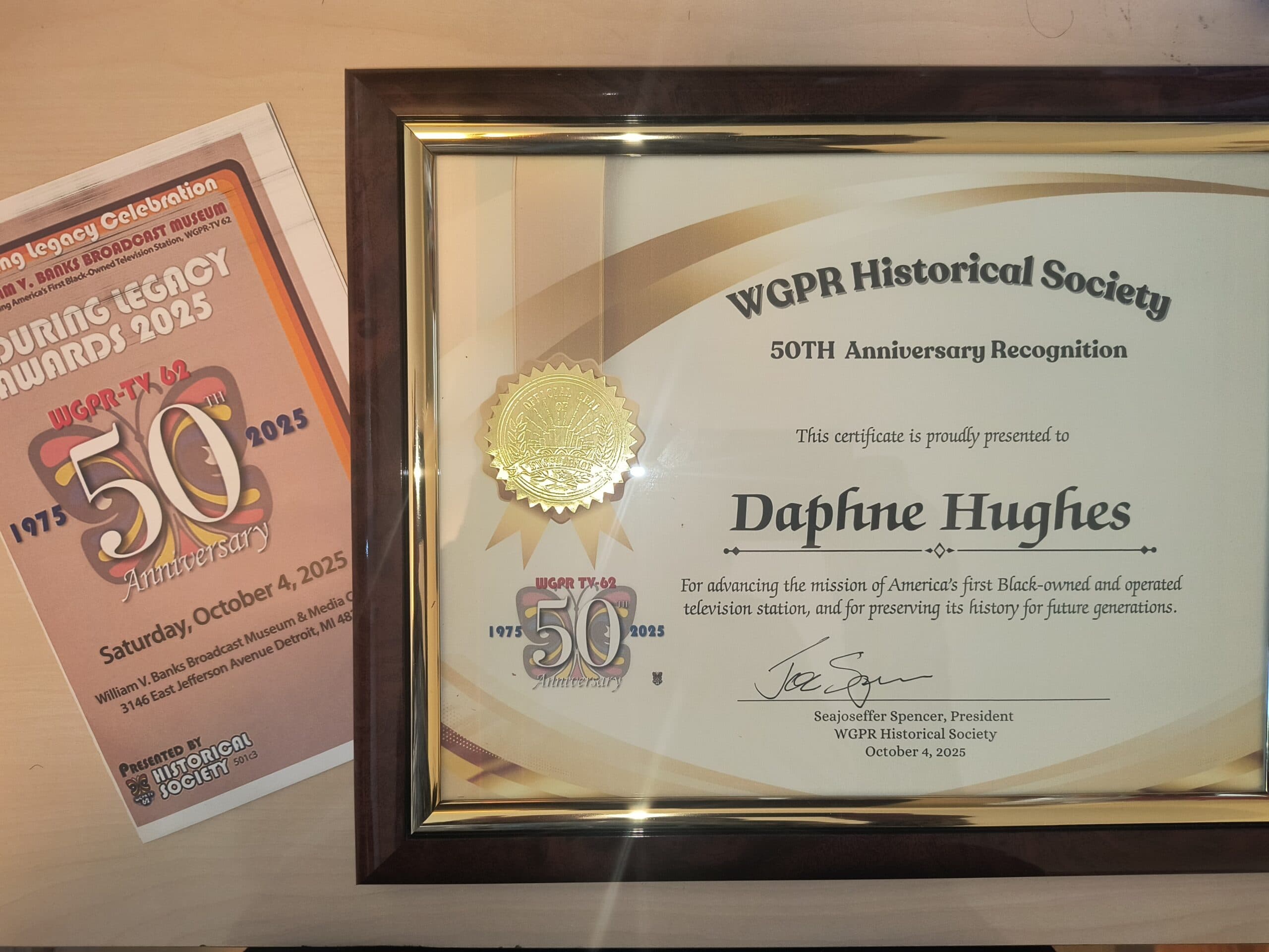 American Black Journal producer Daphne Hughes received WGPR Historical Society’s “Enduring Legacy Award” along with eight others on Oct. 4. The awards were presented during the 50th anniversary celebration for the former WGPR-TV 62. The Detroit station became the nation’s first Black-owned and operated television station when it began broadcasting on September 29, 1975.